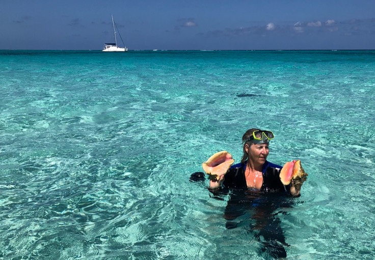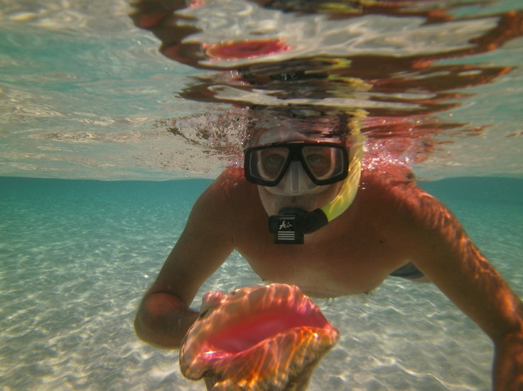 Conch Muscheln (Aussprache der Einheimischen: „Conc“) inklusive ihrer Bewohner sind in zahlreicher Menge auf dem sandigen Meeresgrund des geschützten Marineparks zu finden.