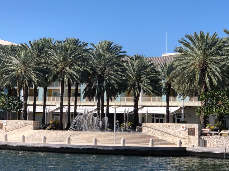 Die Camana Bay am Wasser mit üppigen Palmen und Springbrunnen. Nachts ist die Camana Bay farbenprächtig beleuchtet.