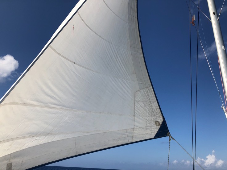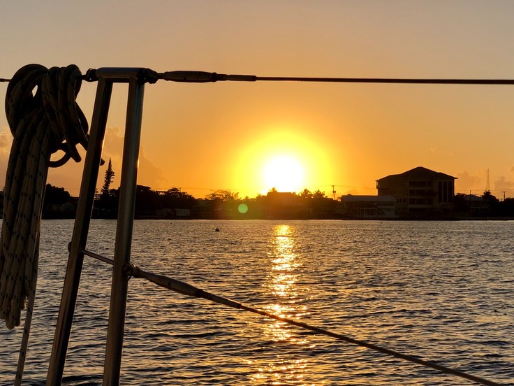 Ohne sentimental zu werden übernachten wir noch ein letztes Mal an „unserer" orangen Boje im Hafen von Georgetown. Mit einem letzten Funkspruch mit der Küstenwache und dem Hafenmeister verabschieden wir uns noch vor dem Ersten Sonnenstrahl am Horizont von Grand Cayman. Wir setzen die Segel und nehmen Fahrt auf. Auf und davon in einen herrlichen Sonnenaufgang. Die Rauschefahrt beginnt mit einer Tasse dampfend heissem Kaffee in der Hand. Wir blicken ein bisschen wehmütig zurück, während die Insel immer kleiner wird und schliesslich in einem schmalen Strich am Horizont im Meer versinkt.