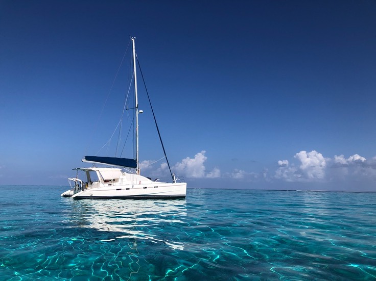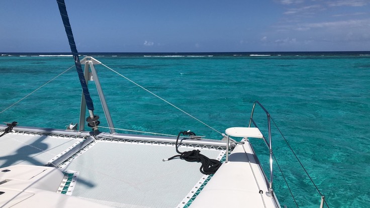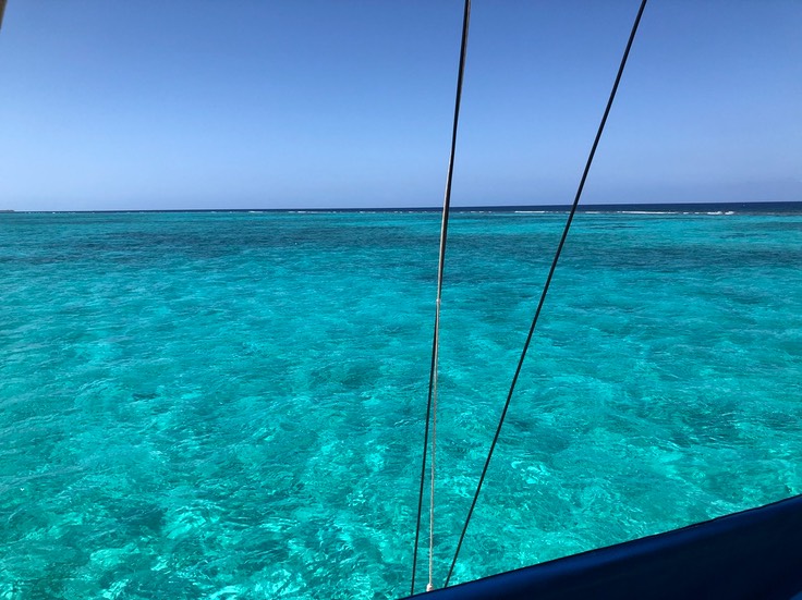 Von Deck der SeaBorne sieht man den hellen Sandfleck der Stachelrochenstadt