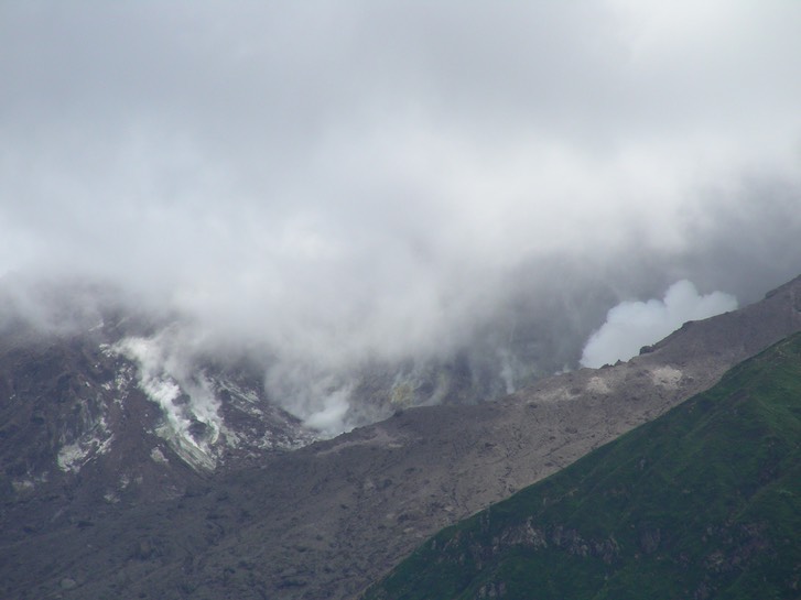 Der Gipfel des Vulkans steckt meistens unter einer Wolkendecke, so auch bei unserem Besuch. Dampf und Schwefel treten immer noch aus und schleichen den Vulkan hinunter.