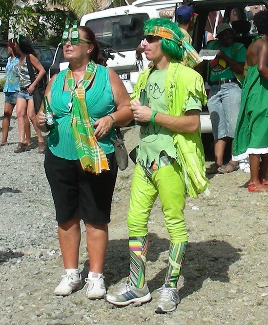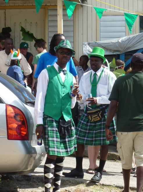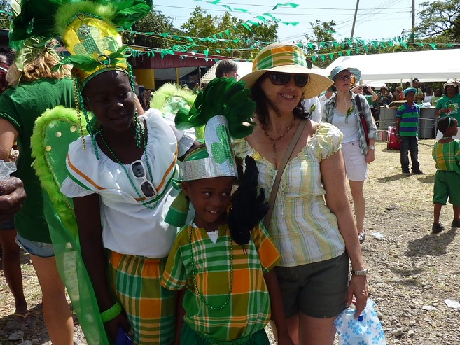Eigentlich wollten wir nur drei Tage hier bleiben, doch viele Leute sind geradezu enttäuscht, weil wir abreisen ohne den berühmten St. Patrick's Day miterlebt zu haben. Wir beschliessen noch einen Tag länger zu bleiben. Die meisten europäischen Einwanderer sind Iren, z.B. ist der St. Patrick’s Day ein gesetzlicher Feiertag (Sklaven Befreiung) und auf der Flagge Montserrats ist das Irische Nationalsymbol die Harfe abgebildet. Durch Rückwanderung nach dem verheerenden Ausbruch des Soufrière Hills 1995 nahm die Bevölkerung zwischen 1998 und Heute wieder stärker zu. Die irischen Nationalfarben sind Orange, Grün, Weiss. Die Menschen feiern in Liebevolle gefertigte Kostüme zum St. Patrick's Day. An diesem ultimativen Volksfest ist jedermann-frau anwesend. So sieht man auch Heute den typisch irische Einschlag der Menschen. Nicht nur weil sie weiss sind…