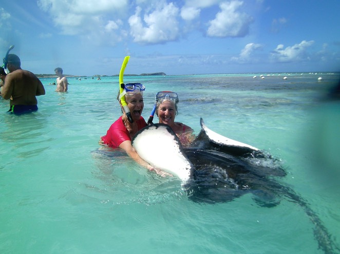 Ein Massen-Touristen-Ausflug in die seichte Lagune wo sich die grossen Stachelrochen herum treiben und auf das mitgebrachte Futter warten. Kleine Sepias werden ihnen als Leckerbissen serviert. Dafür dürfen die Touristen auch mal streicheln, und für Fotos posieren. Stachelrochen sind samtig-weich anzufassen, wie "Mushrooms" sagen die Einheimischen, also wie ein fetter Pilz fühlen sie sich an und sie sind hier ausnahmsweise sehr zutraulich. Sie leben in Freiheit und können gehen wann immer sie wollen. Doch das sichere Futter lässt sie immer wieder an diesen Ort zurück kehren. Dann lassen sie auch die Touristen gewähren…