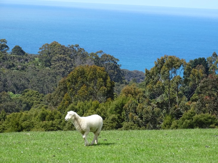 In der Ferne der weite Ozean und auf den Hügeln saftiges Grün für die Schafe.