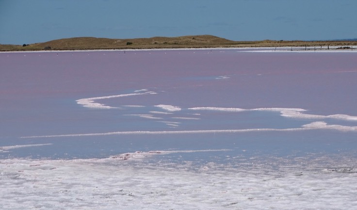 Der „Pink Lake" Salzsee bei der Ortschaft Meningi
