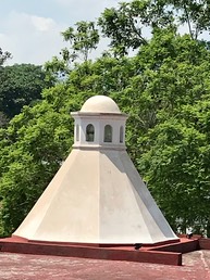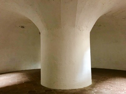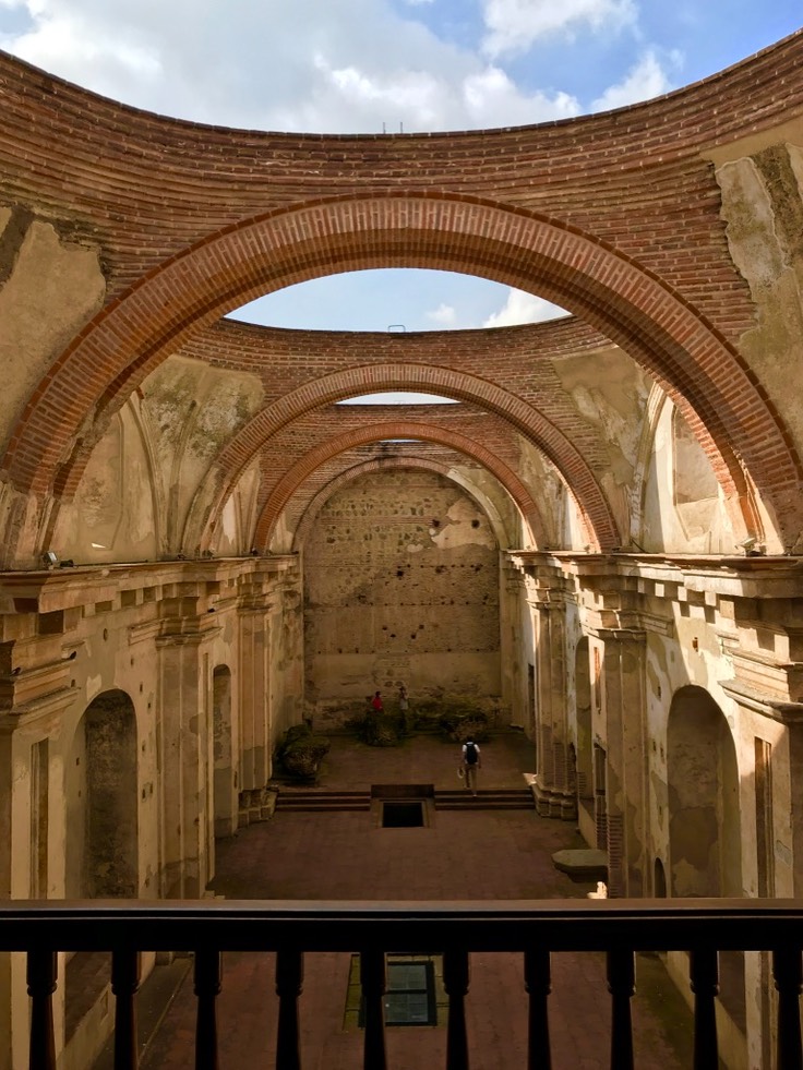 Bild Oben: Einzigartig war in Antigua der 1736 fertiggestellte „Turms der Zurückgezogenheit“. Um einen kreisrunden Patio sind 18 kleine Einzelzellen angeordnet, die alle über eine eigene Toilette mit darunter liegenden Wasserkanal verfügten. Eine schmale Treppe führt in das ebenfalls kreisrunde Kellergewölbe, den die Nonnen wegen seiner Kühle als Vorratskammer nutzen.