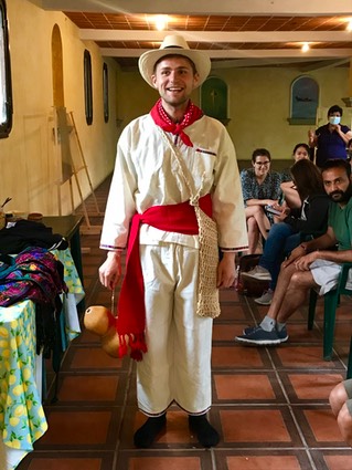Links die Indigenen Trachten aus verschiedenen Regionen. Rechts ein junges Paar aus Polen das uns die Hochzeitstracht von Antigua vorführt.