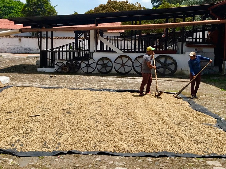 Nach der Ernte werden die Kaffeekirschen an der Sonne getrocknet. Dazu müssen sie laufend gewendet werden.