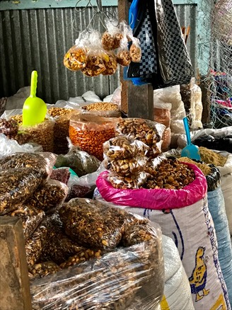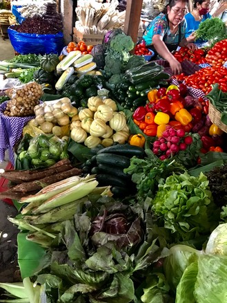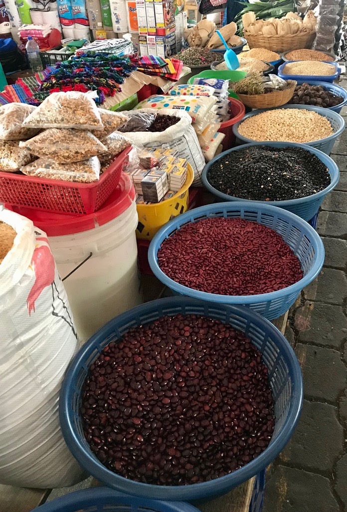Es ist Samstag, ein Marktbesuch ist auf dem Programm. Es gibt einen riesigen Markt in Antigua unter freiem Himmel, den kenne ich schon zum Teil. Einen noch viel grösseren Markt unter Dächern und Planen, den ich eher per Zufall entdecke liegt ganz versteckt etwas abseits und er ist riesig. Ich stürze mich ins Getümmel und bahne mir meinen Weg durch die schmalen Durchgänge. Ein riesiges Angebot an Blumen, Gemüsen, Früchten, frischen sowie getrockneten. Frisches Fleisch, Geflügel, Eier, Gewürze, Hülsenfrüchte und natürlich Mais, Mais, Mais das Grundnahrungsmittel in allen Variationen. Frisch, gebacken, getrocknet in den Farben Gelb, Rot, Schwarz und Weiss, gemahlen und zu Tortillas verarbeitet. Es erschlägt mich fast von so vielen Angeboten. Stand an Stand, Waren an Waren in grossen Mengen einer folgt dem Nächsten soweit ich schauen kann.