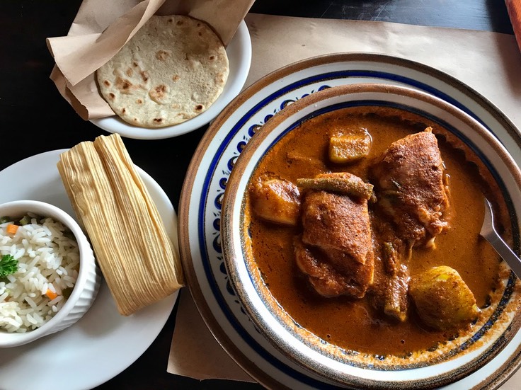 Eine guatemaltekische Spezialität „Pepián“. Dreierlei Fleisch in einer leckeren Sauce mit Kartoffeln und Gemüse, dazu Reis, Maistortillas und im Maisblatt eingewickelte Tamales (Maisklösschen).