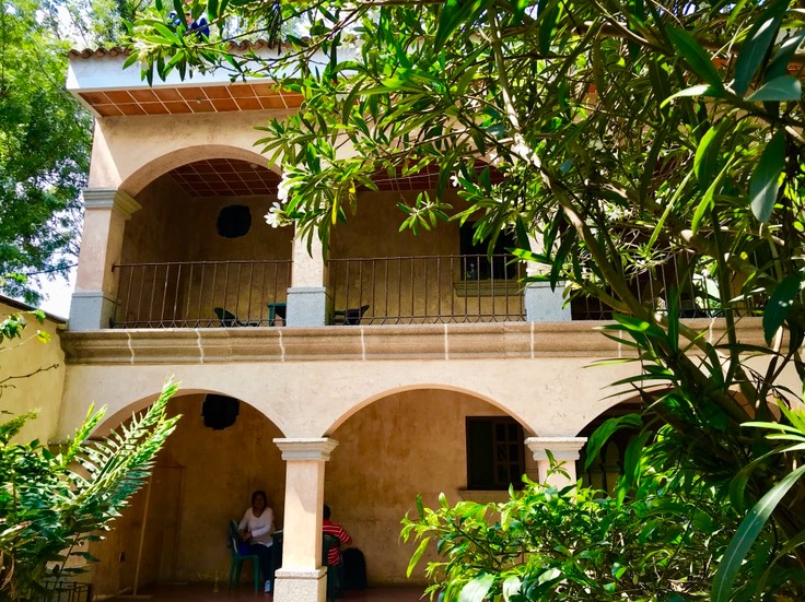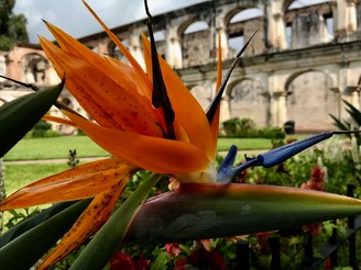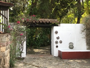 Domingo wartet schon auf mich, er ist schätzungsweise um die 65. Plus, zwei Kopf kleiner als ich mit pechschwarzen Haaren und einem schelmischen Grinsen im Gesicht wenn er seine Maske lüftet. Er ist ein Maya und kommt vom Nachbardorf Jocotenango. Er ist mein Maestro / Lehrer und vom ersten Moment an total sympathisch. Wir verlassen die Schulzentrale, gehen quer Beet durch die Gassen von Antigua bis wir an ein grosses graues Eisentor kommen. Was sich dahinter befindet kann man von Aussen nicht erahnen. Als Domingo das Tor zur Seite schob und mich hinein führte war ich überwältigt. Es ist ein wunderschöner Garten den ich betrete. Spontan fällt mir der Name "Garten Eden“ ein. Aber überzeugt euch selber.