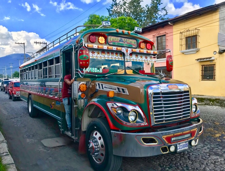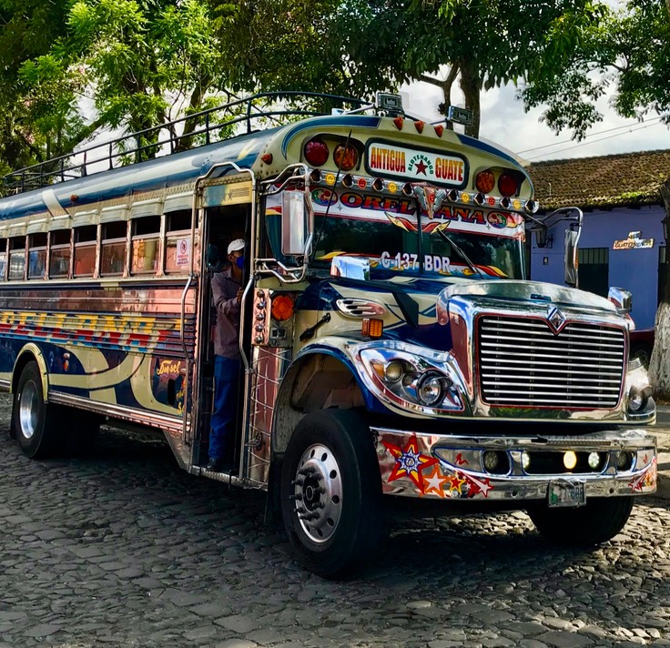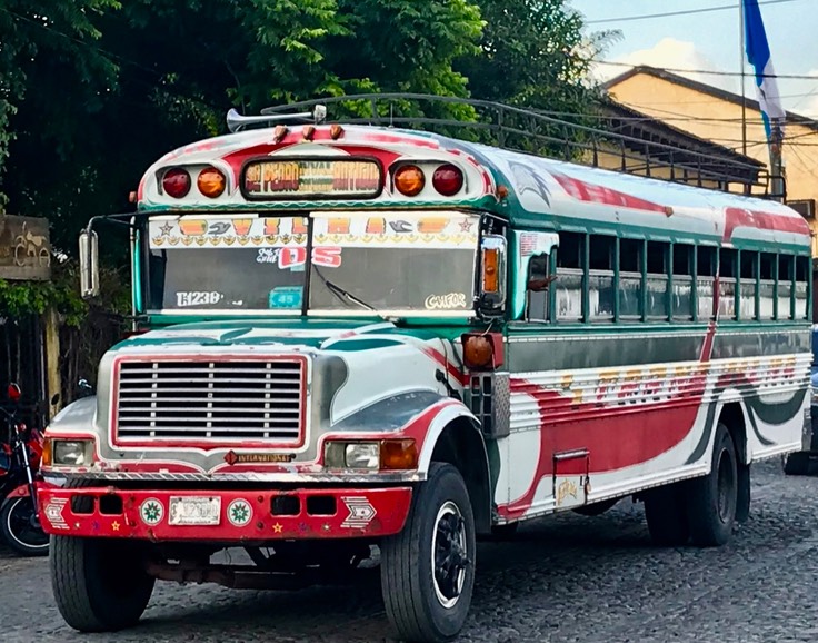 Der Name Chicken Bus kommt von lebenden Hühnern die von Dorfbewohnern in diesen Bussen quer durch Guatemala transportiert wurden, heute ist das aber eher selten der Fall. Die bunten Chicken Busse gehören zum Markenzeichen Guatemalas und ein jeder Besucher sollte sich eine Fahrt im Chicken Bus gönnen, es ist ein Erlebnis.
