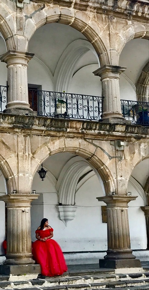 Diese junge Frau in ihrem roten Kleid habe ich im Säulengang mit meiner Kamera eingefangen. Sie war nicht die einzige Frau im langen Kleid an diesem Tag, ich habe viele andere junge Frauen gesehen und fragte mich warum die alle vor den Kameras ihrer Familien posieren. An diesem Tag war für die jugendlichen Damen ihr symbolischer Geburtstag wo die Mädchen zur Frau werden. Nämlich an ihrem 16. Geburtstag werden sie mündig, dürfen heiraten und Kinder kriegen. Das wird hier gefeiert fast wie eine Hochzeit. Im Übrigen sollten die Damen nach traditioneller Sitte jungfräulich in die Ehe eintreten.