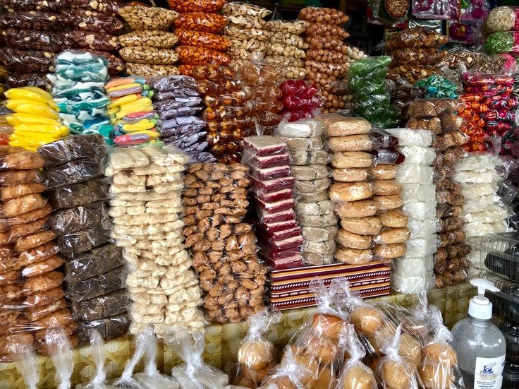 Ein Marktstand vor der Sonntagskirche. Alles meist klebrig und zuckersüss.
