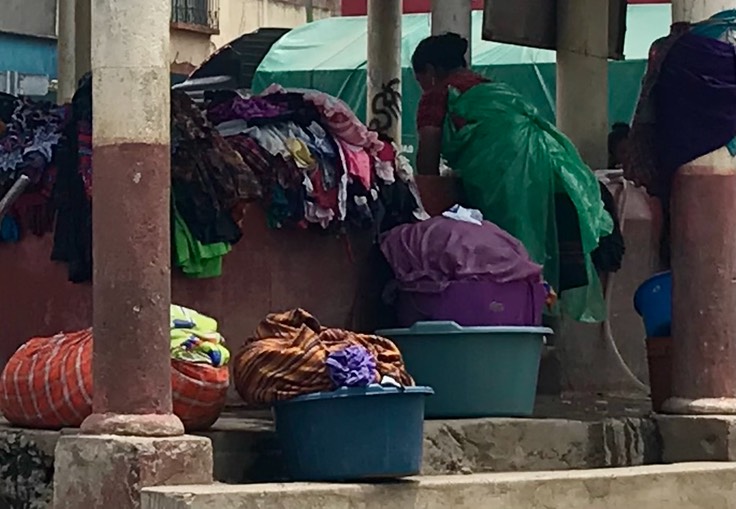 Sie waschen ihre Wäsche auf einem öffentlichen Waschplatz, meist in der Mitte des Dorfes. Sie bringen auf dem Kopf balancierend einen riesigen Packen Kleider an die Waschstelle, dort wird mit anderen Frauen den ganzen Tag verbracht und Wäsche gewaschen. Von Hand versteht sich und mit Seife. Es gibt kleine aus Stein gemauerte Waschbecken wo die Wäsche geschrubbt wird. Die Frauen arbeiten hart. Sie schrubben, waschen, schwatzen, lachen, und essen zusammen ihr Mitgebrachtes Essen, bis ihre Wäsche am Abend fertig ist. Dann kehren sie mit ihrem riesen Wäschepacken auf dem Kopf zurück nach Hause. Gibt es in den Dörfern weit Ausserhalb an den Brunnen kein Wasser mehr, müssen die Frauen mit ihrer ganzen Wäsche in den Bus steigen und hinunter nach Antigua fahren, dort gibt es meist genügend Wasser.