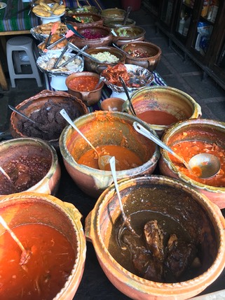 Markthändler die Speisen wie Suppen, Süsses, Tortillas und Tamales anbieten. Auch Kunsthandwerk wird verkauft.